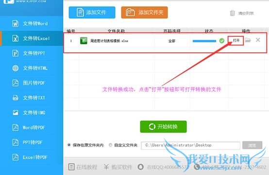 步骤3:点击软件上的“开始转换”按钮,等待片刻即可转换完成。转换完成后,大家可以看到原pdf文件显示成excel文件,大家可以点击“打开”按钮,快速打开转换生成的excel文件。