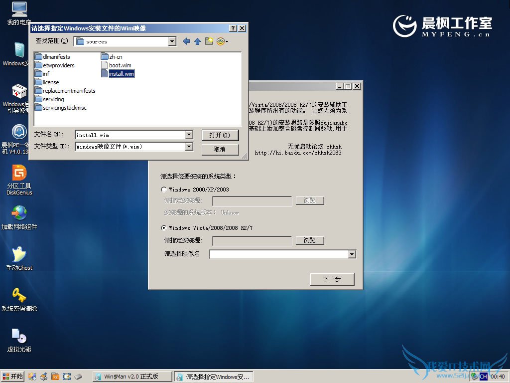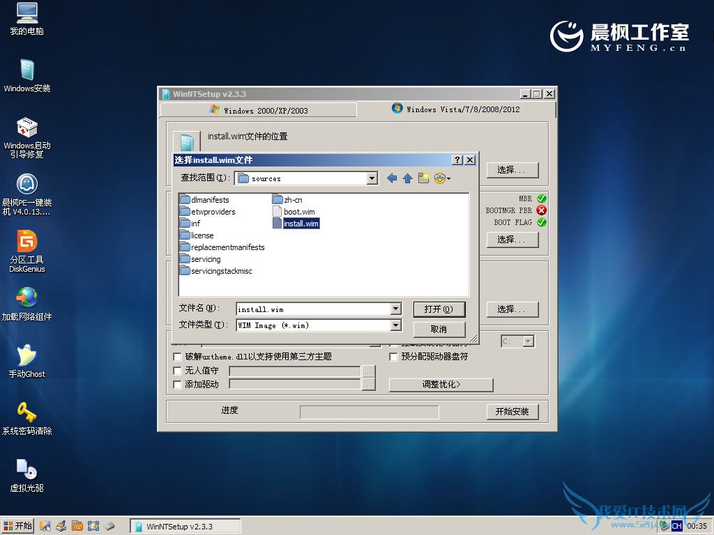【方法2】通过Win7安装盘sources目录下的install.wim利用NT6安装工具进行安装。可以自行将win7安装盘里sources目录下的install.wim提取到U盘或者硬盘某个分区,然后直接进入PE利用下面的安装工具来安装。(32位64位系统通用)