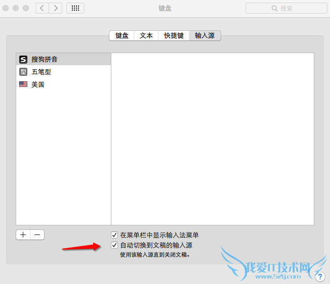 第四步、选择“自动切换到文稿的输入源”,这样你经过前期的两三次切换为第三方输入法后,以后每次打开这个程序就都会是默认第三方了。不需要设置,而是自动因为你的习惯而改变。
