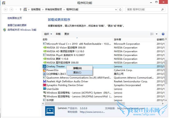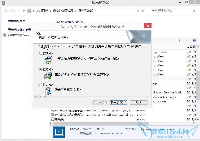 在Metro界面中找不到一键影音图标,可在“控制面板”中“修复”“OneKey Theater”来解决,如下图: