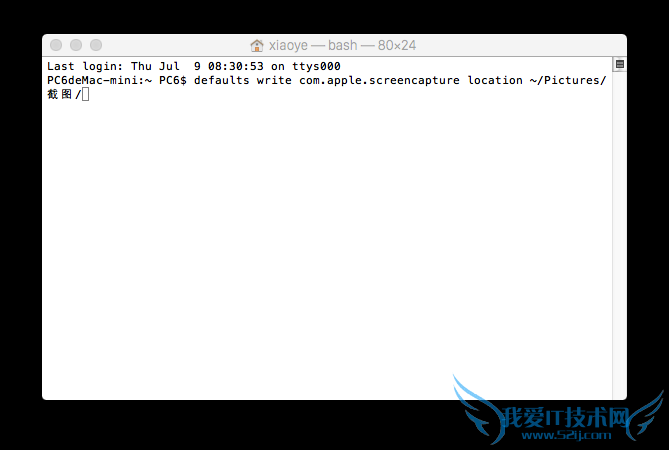 第二步、打开终端,输入“defaults write com.apple.screencapture location ~/Pictures/截图/”后回车