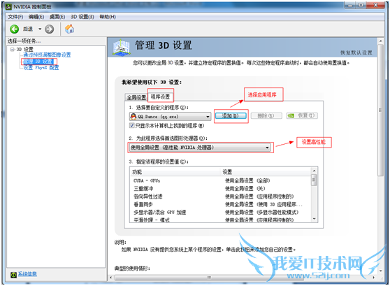 2. 点击“3D设置”菜单下的“管理3D设置”,在视图下选择“将‘用图形处理器运行’添加到上下文菜单”;在“程序设置”下的“为此程序选择首选图形处理器”下拉菜单中选择“高性能NVIDIA处理器”,点击应用
