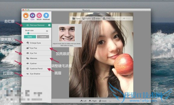 3、每一个美化功能都有动画讲解,妹子们无需读界面上的英文就能学会如何做,以下是眼部美化,也是设计超专业,操作超简单的功能: