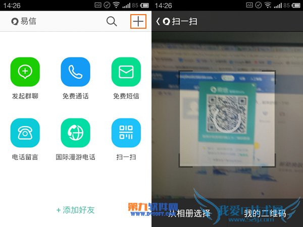 看到易信的二维码后,打开“手机易信”,在易信客户端,点击右上角的“+”,点击“+”后选择“扫一扫”,对着网易邮箱的二维码进行扫描。