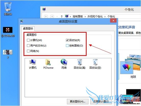 在打开的窗口中我们找到了没有系统图标的原因,原来他们藏在这里。我们可以看到,在“桌面图标”选项中只有“回收站”被选取,所以在桌面上只有它有所露出。