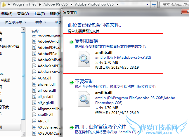 将补丁文件amtlib.dll拖入Photoshop CS6安装目录中覆盖目录中的同名文件。