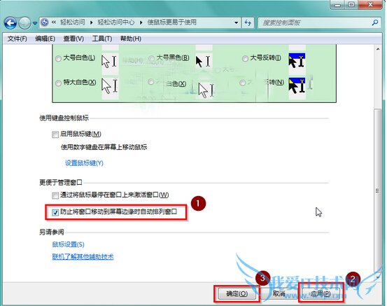 3、在打开的更改鼠标的工作方式窗口中,将页面拉到最底端,勾选“更便于管理窗口”下的“防止将窗口移动到屏幕边缘时自动排列窗口”复选框,然后在点击“应用”,在用鼠标点击“确定”就可取消窗口最大化这个功能了。