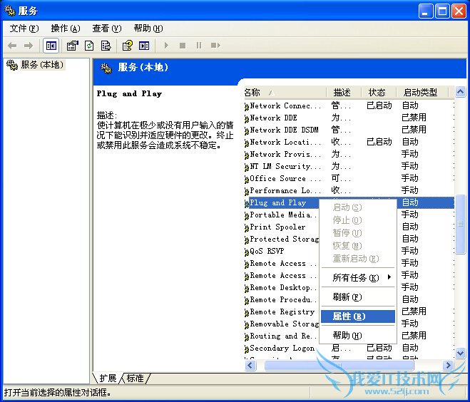 2.打开“服务”后在右边找到“Plug And Play”按右键选择“属性”;如下图所示: