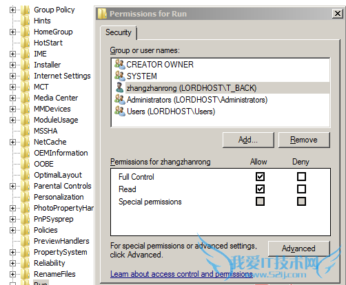 2. 从树顶端的两枝(HKEY_CURRENT_USER和HKEY_LOCAL_MACHINE)开始定位到Run这个子树节点,一般CURRENT_USER那个权限设置应是okay的,一般只要看LOCAL_MACHINE;