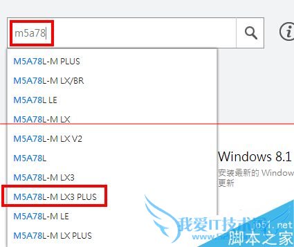 2、输入m5a78然后选择M5A78L-M LX3 PLUS,点击旁边的搜索图标