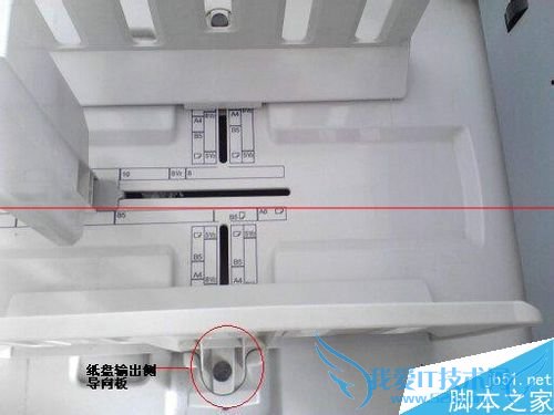 5、调节纸张输出侧导向板使(板上有不同纸张尺寸的刻度标记)之与纸张尺寸匹配。
