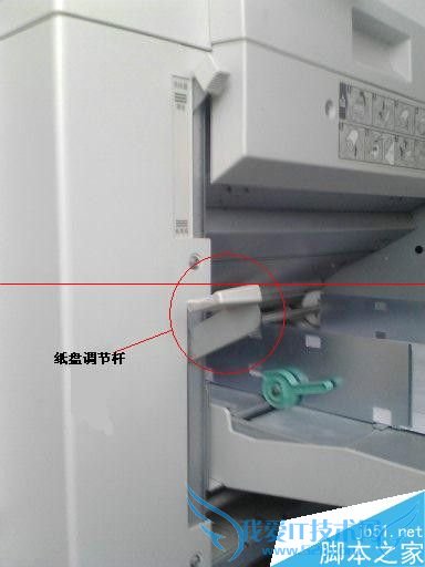 4、将进纸侧导向板与纸张(A4,8K)轻轻接触,将锁定杆移回原来的位置。将纸盘调节杆拉起移到进纸位置。