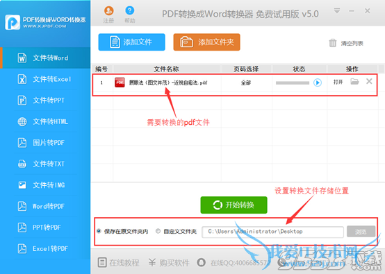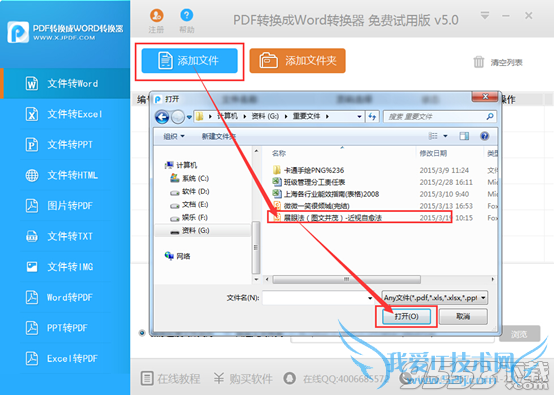 第三步,转换模式选好之后,点击软件中的“添加文件”按钮,在打开的窗口中找到需要转换的pdf文件,选中,然后点击“打开”按钮,将其添加到软件中。