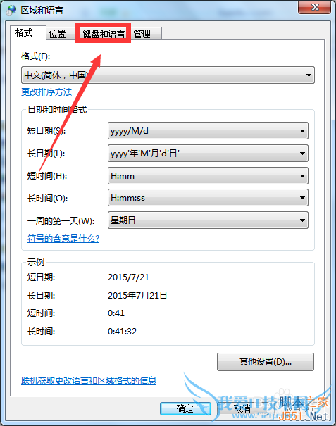 3、进入区域与语言对话框后,点击【键盘和语言】。