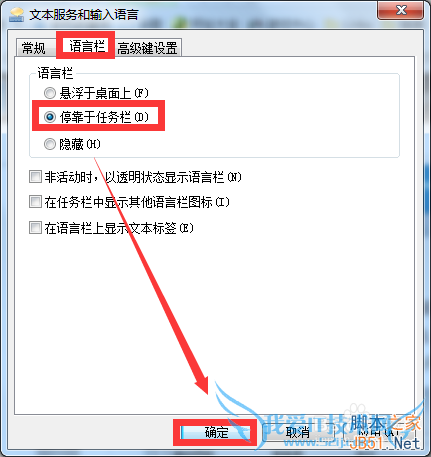 5、在接着出现的文本服务和输入语言对话框内点击【语言栏】选项,并同时对【停靠于任务栏】进行点选,点选完毕后点击【确定】。