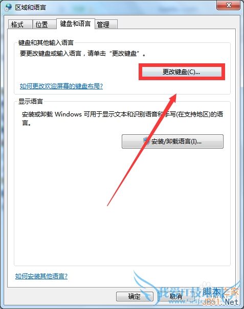 4、在键盘和语言对话框内,点击【更改键盘】,进入文本服务和输入语言对话框。