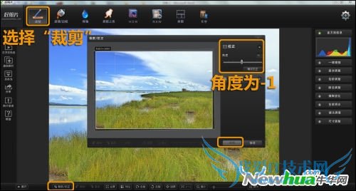 第三步,切换到“调整”,选择“裁剪/校正”,校正角度为-1,点击确定校正,确定应用,使图片的水平线得到校正。