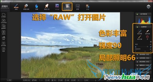 第一步,将Raw文件导入到软件中时,好照片会自动对图片进行解码,重新建立色彩空间并显示图片。接着选择合适的色调映射,为了使图片的颜色看起来更加丰富,此次操作选择“色彩丰富”,强度为90,局部照明为66。