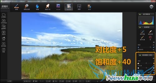 第二步,为了使图片的颜色更加饱满且颜色对比鲜明,饱和度增加40,对比度增加5。好照片的基本调整都是基于32位图像的处理,因此图片的细节和质量会在处理的过程中呈现出更好的效果。
