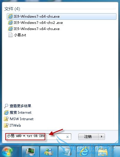 现在,在开始搜索框或是资源管理器右上角的搜索框中输入多个查询关键字试试?例如:小易 and *.txt or IE9