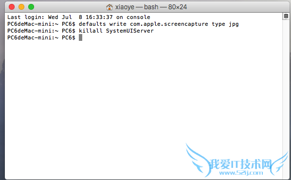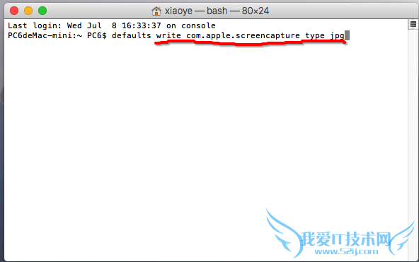 第二步、在终端输入命令defaults write com.apple.screencapture type jpg,后回车