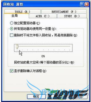 2、我们不妨想一想,用一个简单的办法来解决这个问题:首先用鼠标右键单击“回收站”图标,从快捷菜单中选择“属性”命令,打开“回收站属性”对话框,选择“全局”选项卡,把“回收站的最大空间”设为0%,设置(如图2)所示。确定后,再试试删除刚才删不了的文件,一般就可以了。