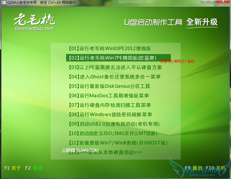 2.电脑重启,部分电脑的BIOS的快捷键可能不一样,记得好像选择启动盘直接是F12的!直接选择从U盘启动就可以了,然后就会出现如下的界面了