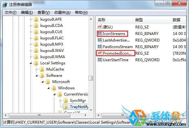 2、打开注册表编辑器后定位到:HKEY_CURRENT_USERSoftwareClassesLocalSettingsSoftwareMicrosoftWindowsCurrentVersionTrayNotify
