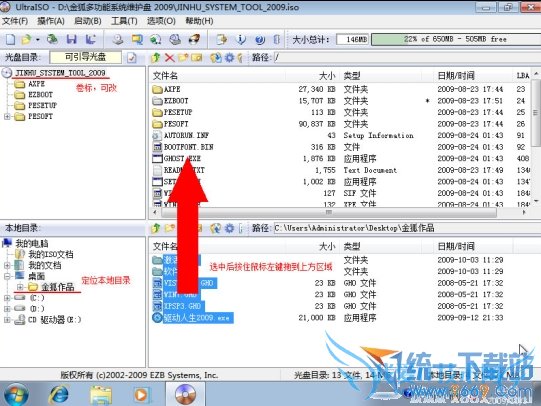由于维护盘不含GHO系统文件,所以刻录时需添加,刻录前已经在桌面上新建了一个 “9669文件夹”的文件夹,里面放了WIN7.GHO、VISTASP2.GHO、XPSP3.GHO三个系统文件,还有“激活工具”以及“软件包”,准备用驱动人生2009带网卡驱动的单文件版替换原来不带网卡驱动的版本。相关方法如图示,在UltraISO界面左下角的“本地目录”里定位到桌面上的 “9669文件夹”这个文件夹,它里面的所有文件会在右下角显示,把要加入ISO镜像的所有文件选中后按住鼠标左键拖到右上角的区域。