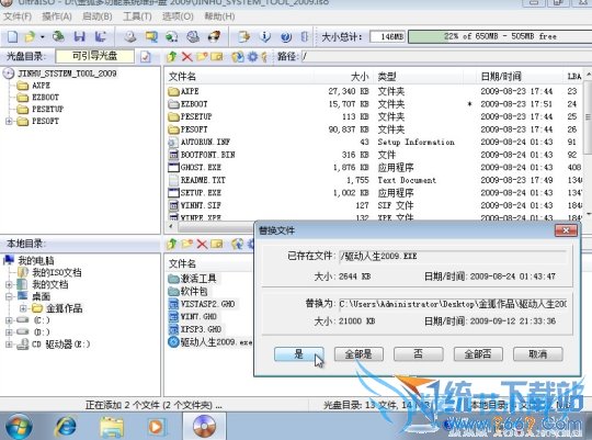 要添加的文件如果原来ISO镜像里已经存在会弹出“是否替换”的提示,确定要替换就选“是”,这样就完成了ISO镜像的修改。如果以后还需要用到这个修改过的ISO镜像的话,可以通过点击“文件”菜单下的“保存”或“另存为”保存修改后的ISO镜像。