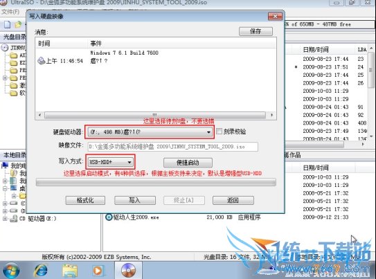 如图示,“硬盘驱动器”里就是选择你要刻录的U盘,这里演示用的是一张数码相机的内存卡。写入方式默认是USB-HDD+,还有USB-HDD、USB-ZIP、USB-ZIP+,共四种供选择,这主要取决于你的主板支持的启动类型,可以在刻录前进CMOS看一下,注意有的主板需要插入U盘才会显示支持的类型。U盘可以在刻录前格式化,也可以通过底下的“格式化”按钮进行,当然直接点“写入”也可以,会自动格式化。