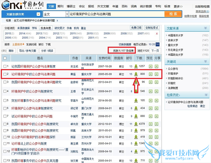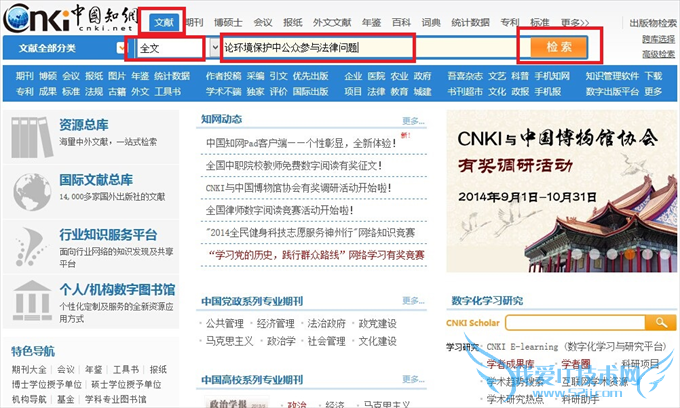 4、如上图,进入中国知网页面后,我开始搜索我需要的论文,假如我的毕业论文题目是《论环境保护中公众参与的法律问题》,那么我就根据上图红色方框的指示,在搜索框中输入文献题目,点击搜索,进入以下结果页面