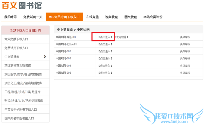 2、登录后,充值为VIP会员,成为VIP会员后,点击“VIP会员专用下载入口”进入文献下载入口页面,如下图,点击进入中国知网入口页面