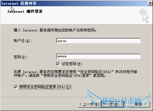 4.在“Internet邮件登陆”中填入之前设置的用户名和密码。例如Aaron设置的用户名和密码均为“aaron”。另外,“使用安全密码验证登陆”一项一定要选中,否则在连接时会报错。如下图: