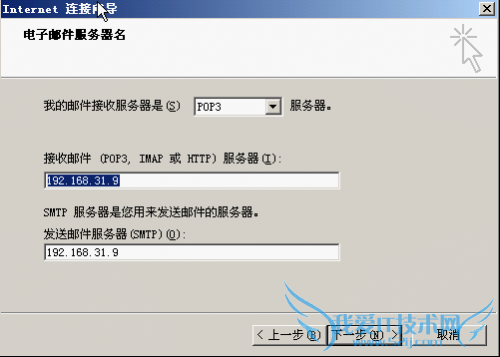 3.在“电子邮件服务器”中进行设置,“接收邮件服务器”和“发送邮件服务器”处均填入邮件服务器的IP地址,如:192.168.31.9。如下图: