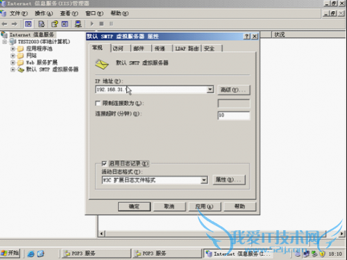 3.在“属性”对话框中的“常规”选项卡中,将IP地址设置为本邮件服务器的IP地址。也可以对最大连接数和日志记录等进行设置,我们保持默认。然后点击“确定”完成配置。如下图: