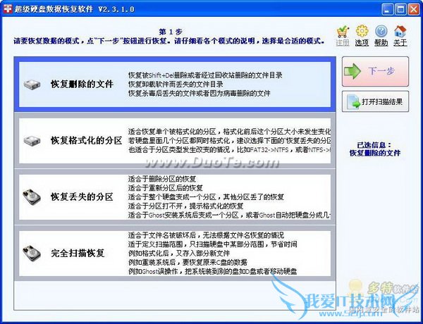 软件评价: 软件对硬盘扫描速度一般,能找出被删除/快速格式化/完全格式化/删除分区/分区表被破坏或者Ghost破坏后磁盘里文件.可以完全恢复删除软件,据说对于删除的文件该软件有独特的算法来进行恢复。