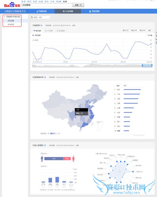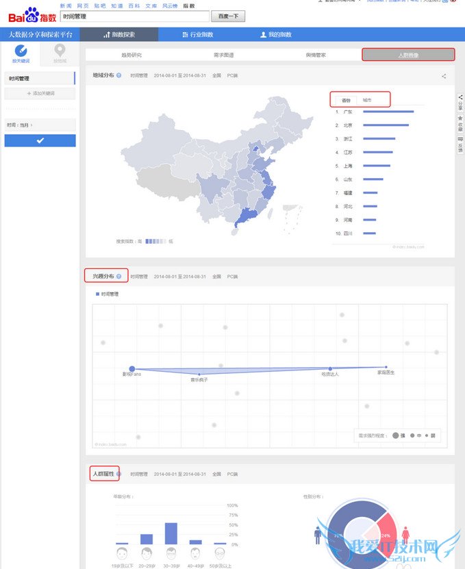 6、人群画像”,分为“地域分布”、“兴趣分布”和“人群属性”。我们可以通过查看本图得到关注“时间管理”一词的人群分布在哪个省市、兴趣是什么、年龄、性别等等信息