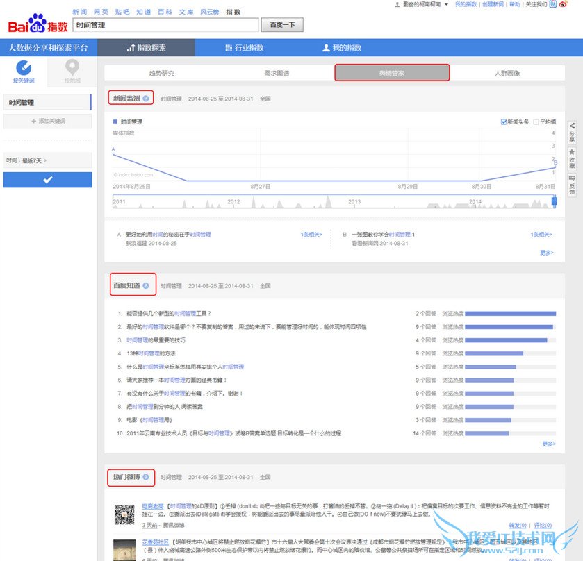 5、“舆情管家”,分为“新闻监测”、“百度知道”和“热门微博”三个分类。大家可以通过“舆情管家”查看关于“时间管理”一词的相关热点