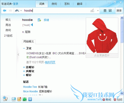 除了新增真人发音功能,有道词典PC5.1版还对图片词典的排序算法进行了优化,如今的默认显示顺序更准确地符合用户的心理预期。比如在查“hoodie”的时候,用户就可以看到一张清晰的大图,对这个单词释义--“帽衫”有了直观的理解。