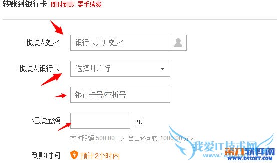 3、在“转到银行卡”页面中的文本框中输入“收款人姓名”、“收款人银行卡开户行及卡号”以及汇款金额等信息,如图所示。