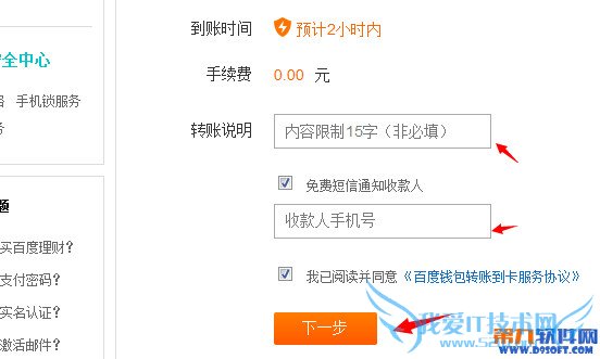 4、在页面中您会看到手续费为0,输入转账说明(不得大于15字),然后输入收款人手机号,最后点击“下一步”按钮,如图所示。最后完成转账操作。