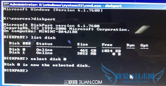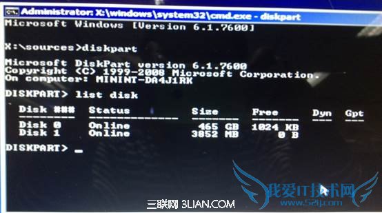4. 输入:”list disk”,查看磁盘信息。注意看磁盘容量来选择。图中465G的Disk 0是硬盘,3852M的Disk 1是用于Win7安装的U盘;