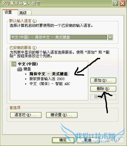 在弹出的下面窗口中,按箭头的指示,选中你不要的输入法,点删除!当你想要的时候,当然也可以从添加加进来!