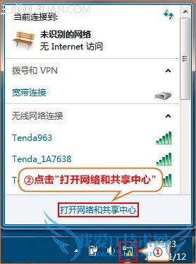 第一步:点击桌面右下角的网络图标,打开“网络和共享中心”