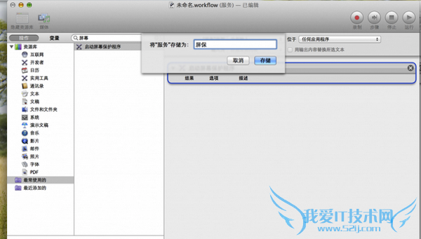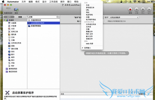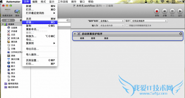 第四步:首先可以到搜索框中输‘屏幕’,所有和屏幕有关的项目就都出来了,包括我想要的‘启动屏幕保护程序’,选中拖动到右面的框里,记住,要把“‘服务’收到”这项改为‘没有输入’,然后到菜单‘文件’中选择‘存储’,输个服务的名称,比如‘屏保’。