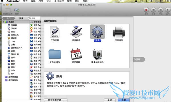 第三步:接下来,会弹出一个窗口,选‘新建文稿’,在弹出窗口中的‘文稿类型’选择‘服务’。