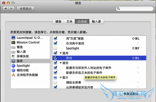 第五步:到‘系统偏好设置’‘键盘’‘快捷键’‘服务’ 中,找到刚刚那个服务‘屏保’,添加快捷键,最好不要和其他的冲突 。