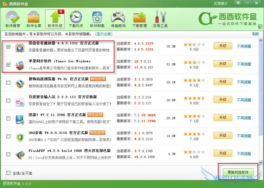 大多数软件在使用一段时间后,功能更强的新版本就会破茧而出。在这个时候,你还要重新上网查找新版本吗?NO!有了“西西软件盒”,升级软件,只需一键。