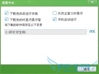 先来指定软件的保存位置。打开程序界面,单击右上角的齿轮状按钮,打开“设置中心”界面,单击“浏览”按钮,在弹出的对话框中选择一个文件夹,单击“确定” 按钮完成。同时确保勾选界面里的“下载完成后运行安装”选项,再单击“确定”按钮,即可进入程序主界面。经过如此简单的设置,以后从“西西软件园”下载的绿软,都可以自动保存在这里(图1)。